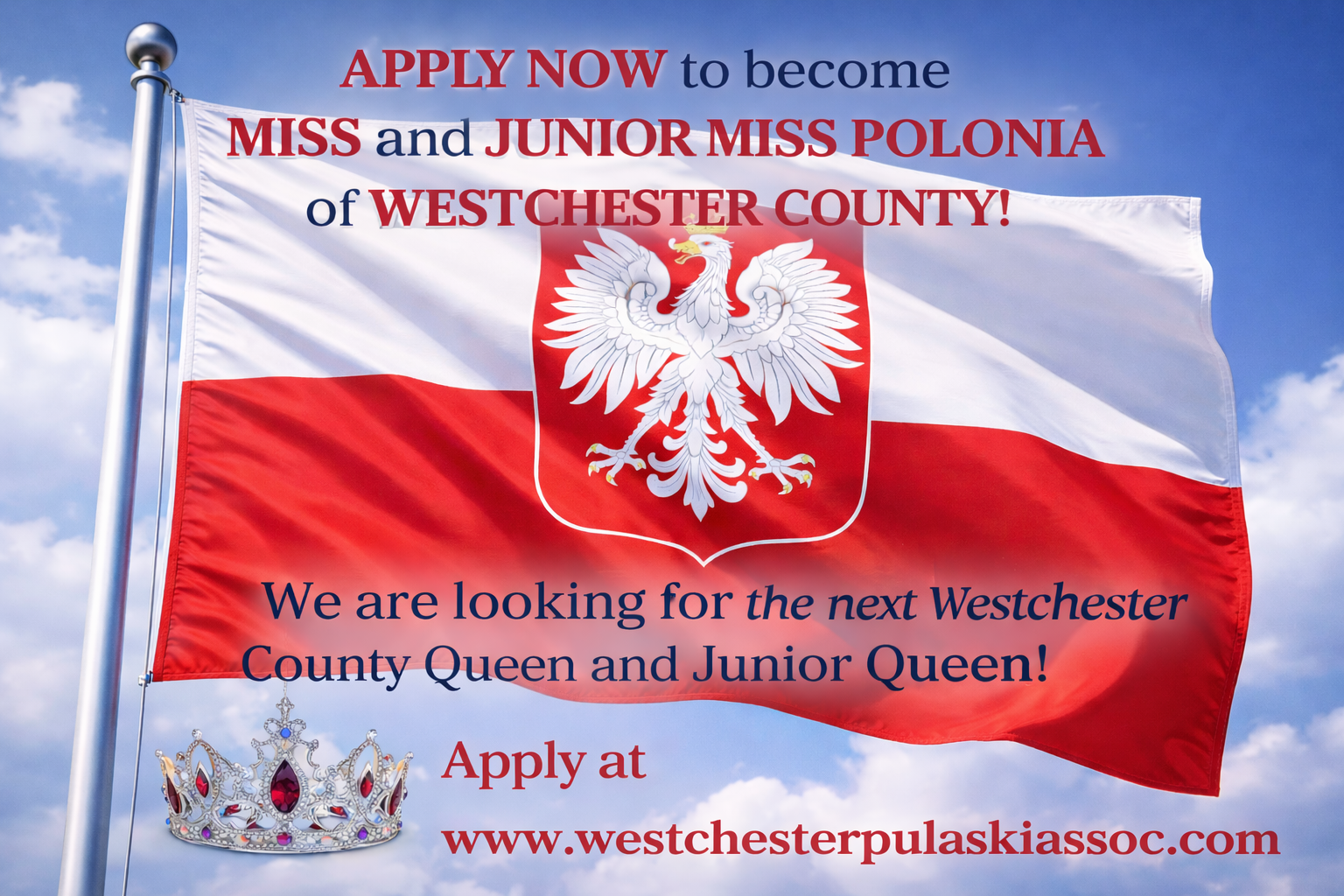 We are calling upon the vibrant young ladies of Polish descent across Westchester County to step forward and celebrate their rich heritage by applying for the prestigious titles of Miss and Junior Miss Polonia. This unique opportunity is more than just a title; it is a chance to serve as a cultural ambassador, build lasting friendships, and represent our local Polish-American community with grace and pride. Whether you are looking to develop leadership skills, engage in community service, or simply honor your family’s traditions, we invite you to embark on this rewarding journey and become a face of our community’s future. Don't miss your chance to wear the crown and make this year truly unforgettable—apply today and let your Polish spirit shine! Deadline to apply is February 9th, 2026. Please click here for more details.